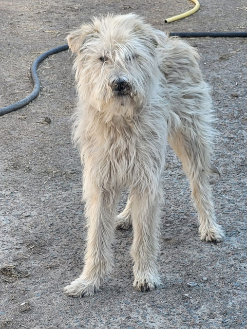 Orlando ist noch recht jung, ca. 2 Jahre, ist etwa 50 cm hoch und 15- 20 kg schwer. Er hat lange mit verschiedenen Krankheiten gekämpft, u.a. mit Zeckenkrankheiten und Staupe. Trotz schlechter Prognose hat er überlebt, er ist also ein echter Kämpfer. Von seinen Erkrankungen sind ein Atemgeräusch und eine stets verklebte Nase zurückgeblieben. Ansonsten geht es ihm heute aber gut. Nur leider lässt er sich überhaupt nicht anfassen. Ob er seine Scheu in Zukunft ein wenig ablegen wird, wissen wir heute leider nicht.